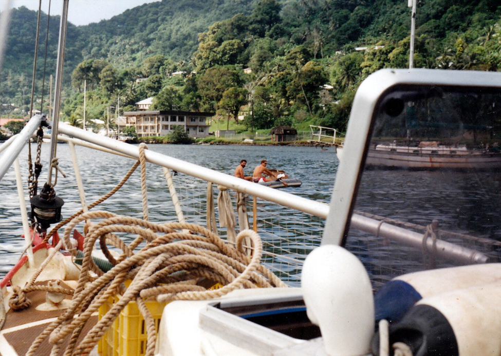 “Another lovely evening in the tropics – watching the moon light up the clear tropical sky – highlighting the edges of thin clouds and shimmering off tall, elegant palms. The air is warm, a slight breeze wafts through the leaves. Daily swimming and diving on the reef in the clear lagoon waters, hiking and camping in the cool, dense jungles of the island’s interior – eating bat stew on the rim of an ancient volcano, swimming in a cold, bottomless crater lake – and becoming lost in a blanketing mist, outrigger canoe trips to uninhabited islands, numerous adventures by trail bike, romance in the setting sun, and night-dipping under the shooting stars. Too many social commitments, too much fun, too damn many women and not enough sleep.” [Journal excerpt, Western Samoa, December 1985]